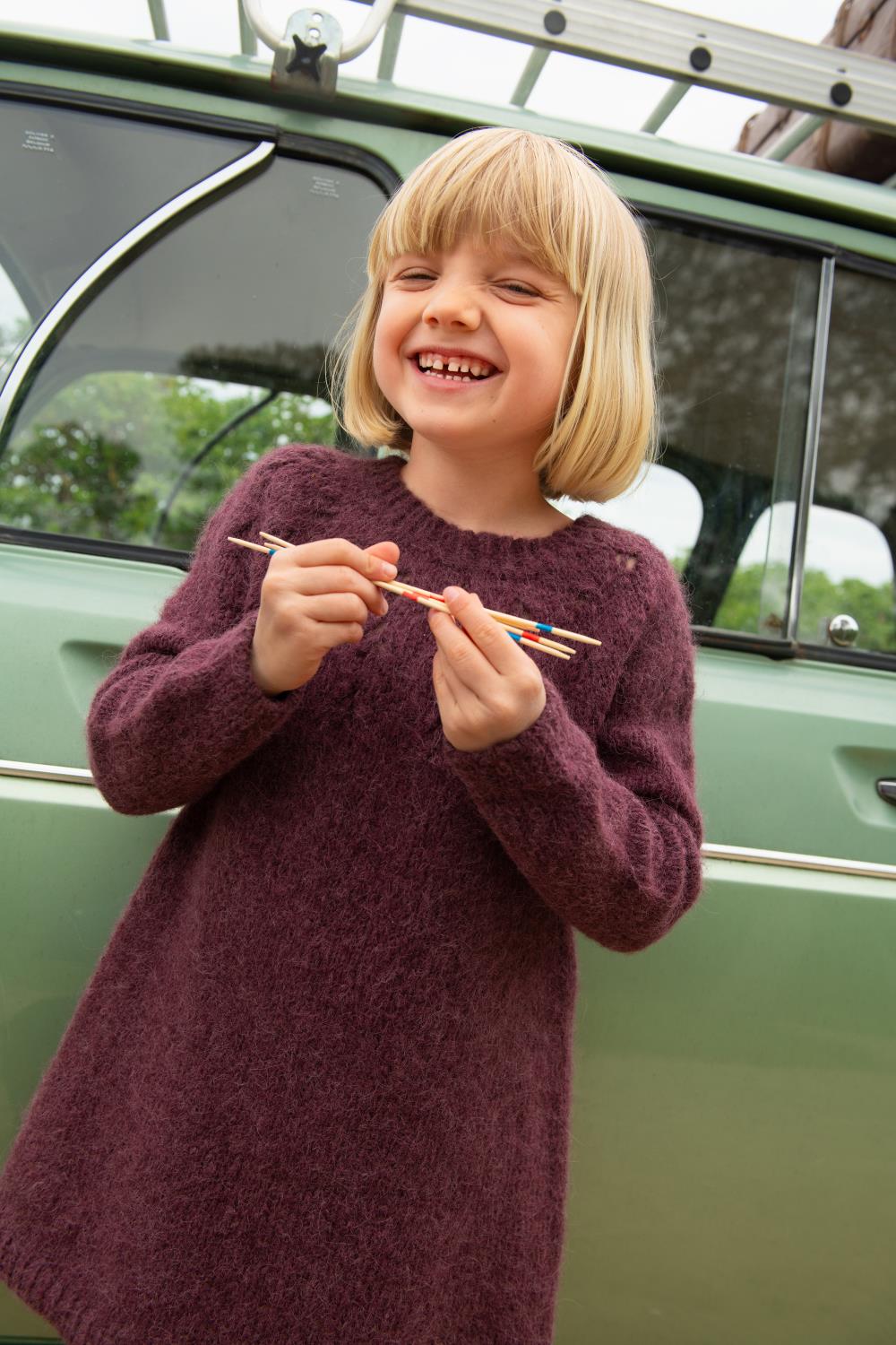 Sweet Pea Dress Junior i Kos har et tidløst kløvermønster som passer til alle anledninger! Kjolen kan strikkes både ovenfra og nedenfra og har en fin vrangbordhals og rundt bærestykke, før skjørtet blir vidt og lekent. Ermene strikkes rundt og avsluttes med vrangbord, en klassiker du vil elske!