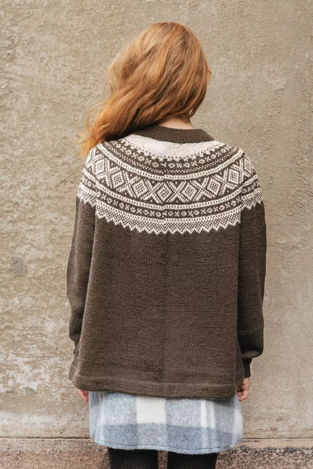 Denne Marius-genseren i Tynn Peer Gynt har en myk A-fasong som gir et moderne uttrykk til det klassiske mønsteret. Strikkes ovenfra og ned.