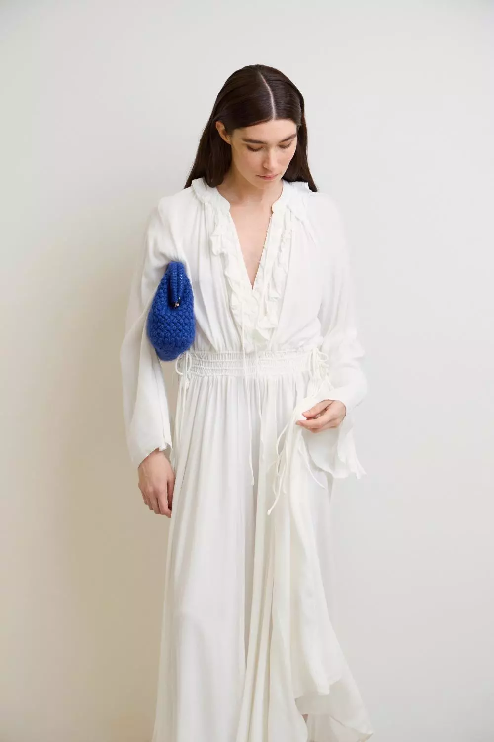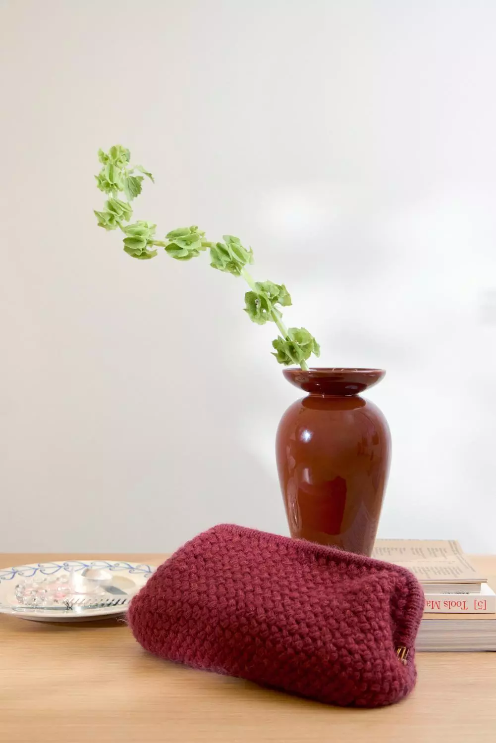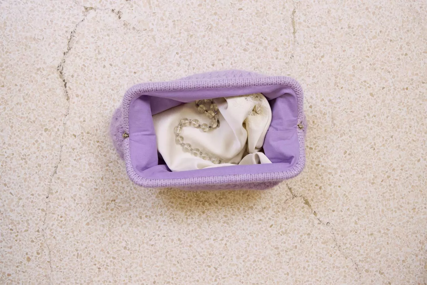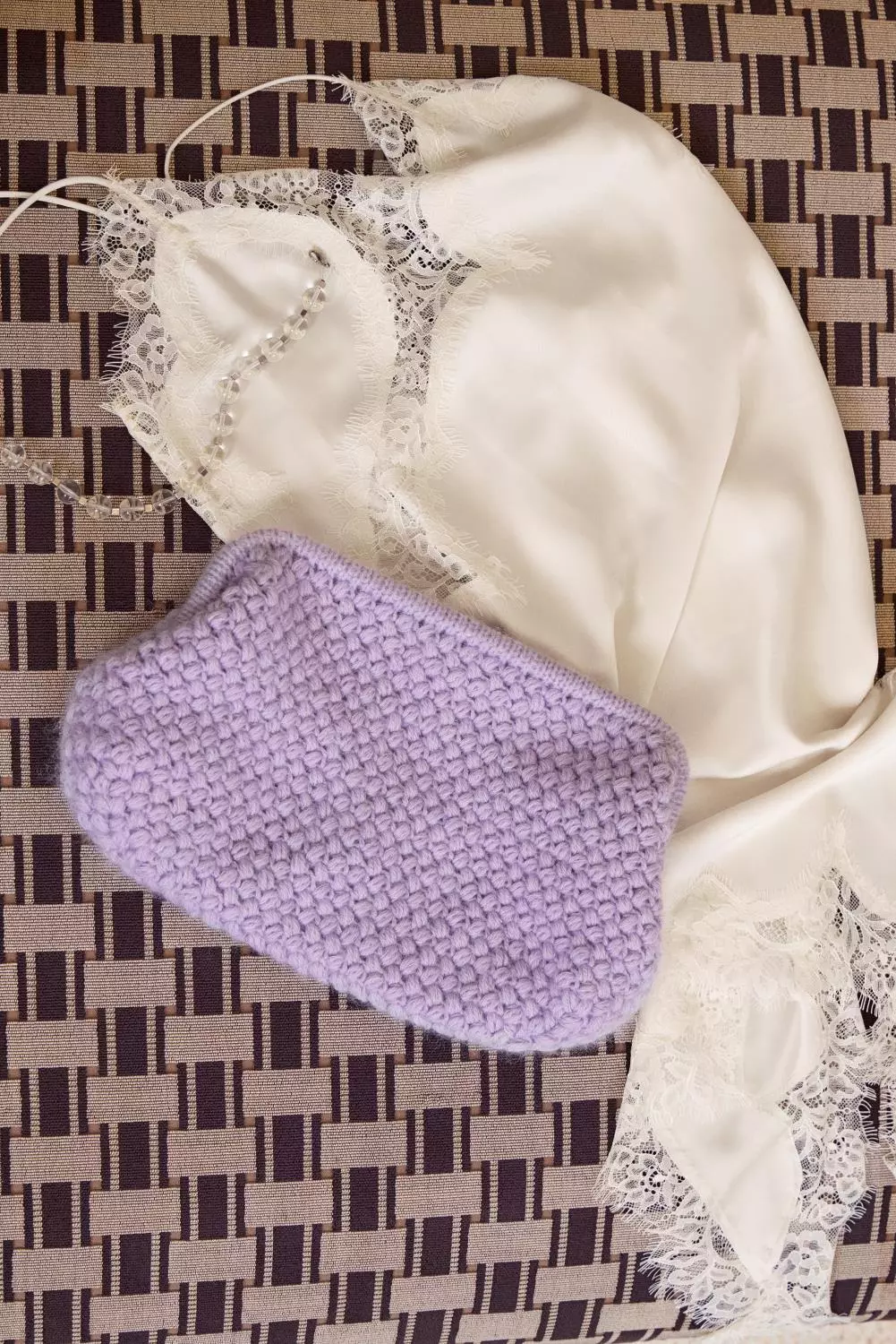 Dekorativ clutch heklet nedenfra og opp i puffmasker, med firkantet bunn og strikket kant rundt clutch-frame. Kombinasjonen av Double Sunday og Tynn Silk Mohair gir et mykt, lett og eksklusivt uttrykk. Clutchen fores og monteres til slutt.
