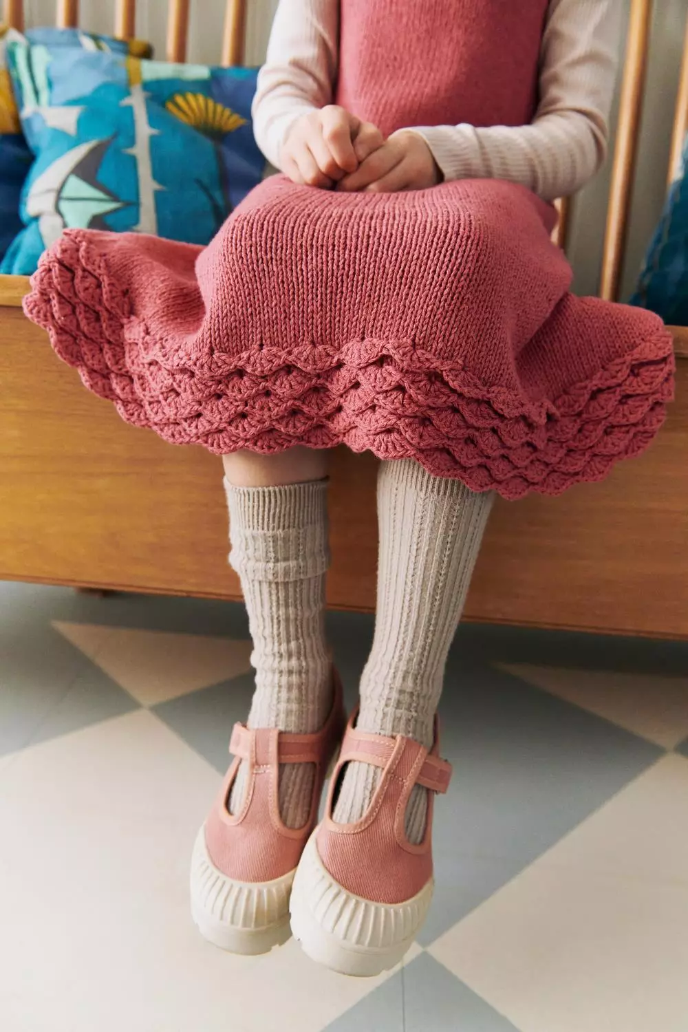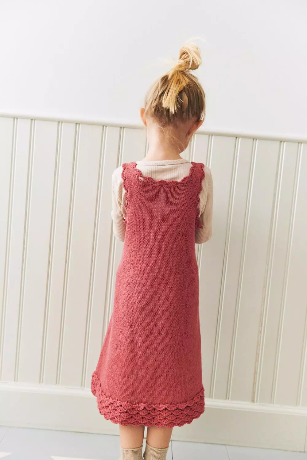 Sommerlig kjole strikket ovenfra og ned i glattstrikk med økninger til A-fasong og heklede tungekanter som gir et lett og lekent uttrykk.
