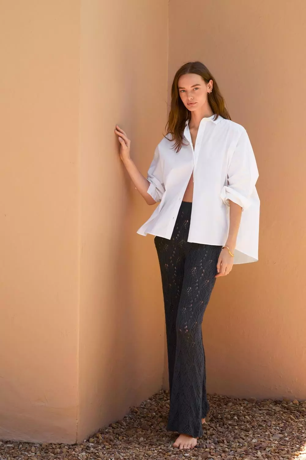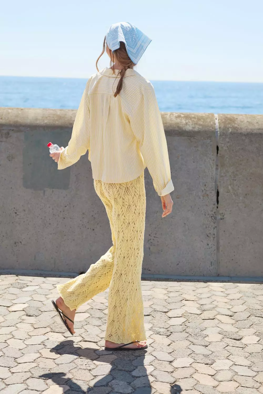 Luftig bukse strikket ovenfra og ned i Line eller dobbel Tynn Line, med elastisk linning og romslig passform.