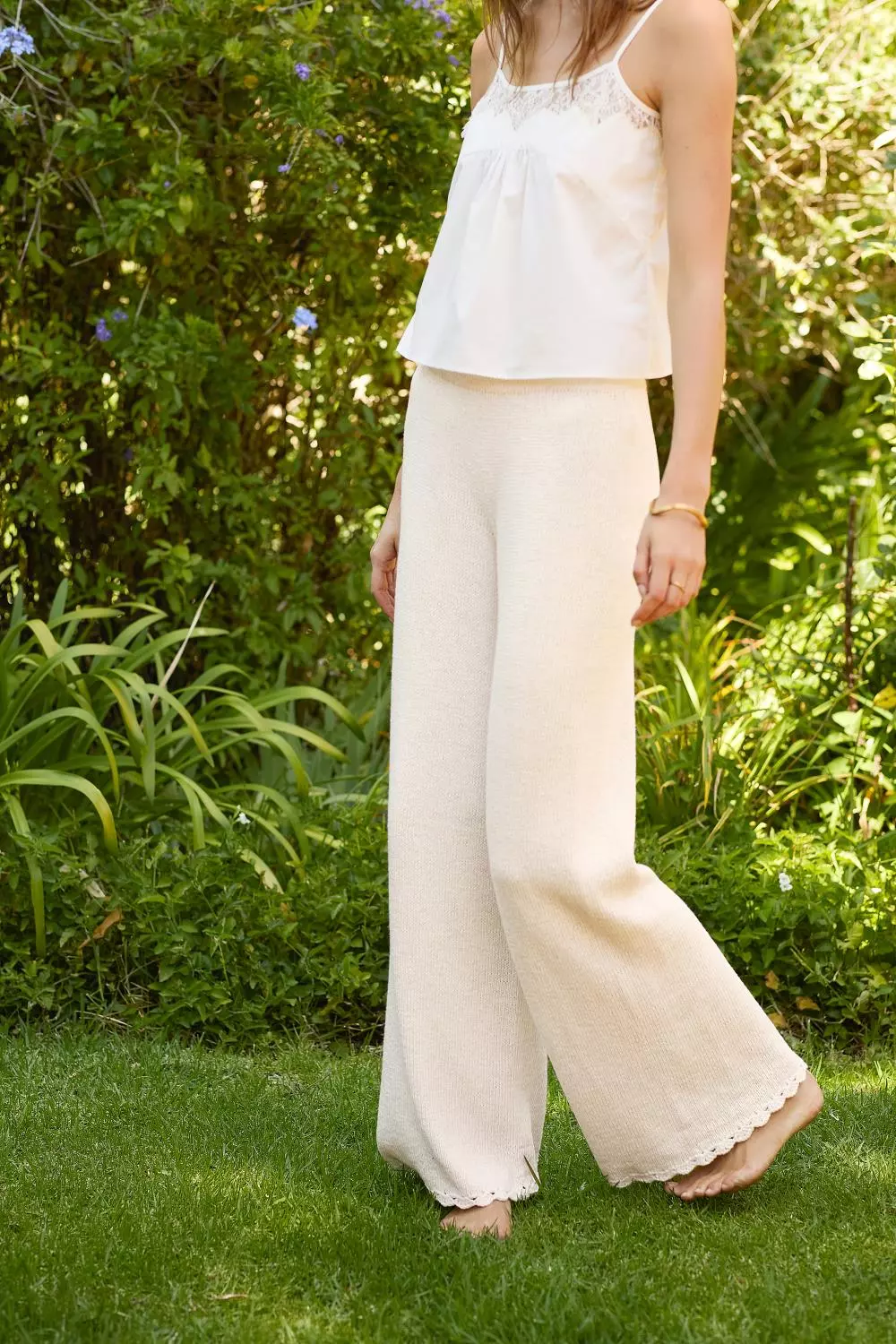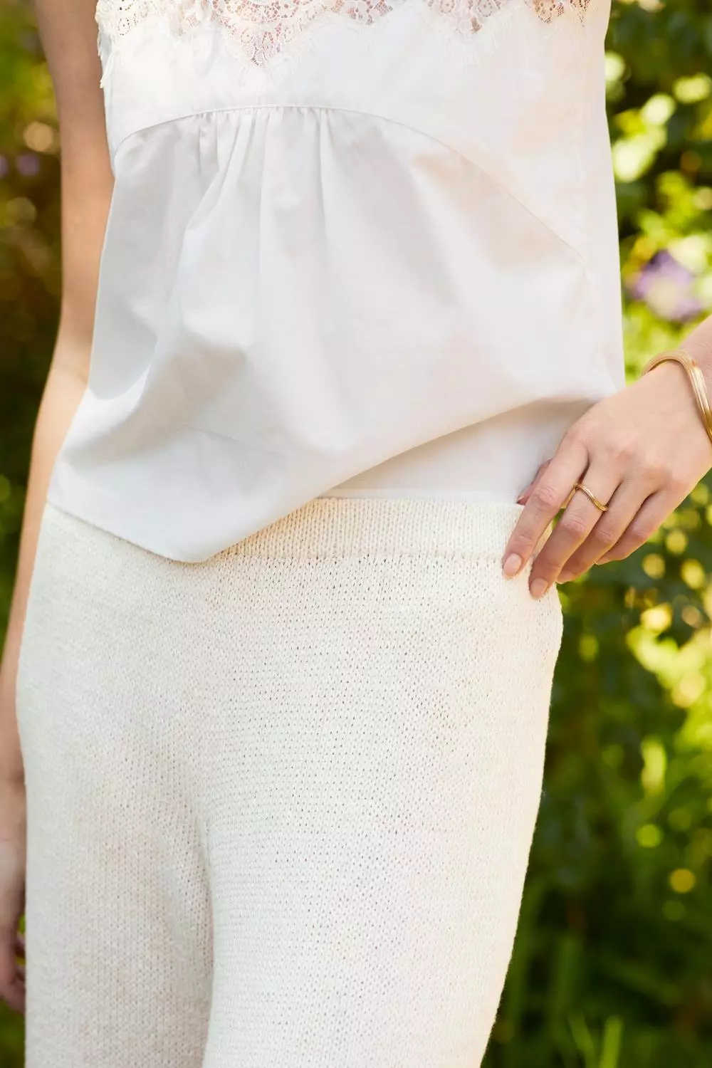 Bukse strikket ovenfra og ned i dobbel Tynn Line, med elastisk linning og heklet tungekant nederst.