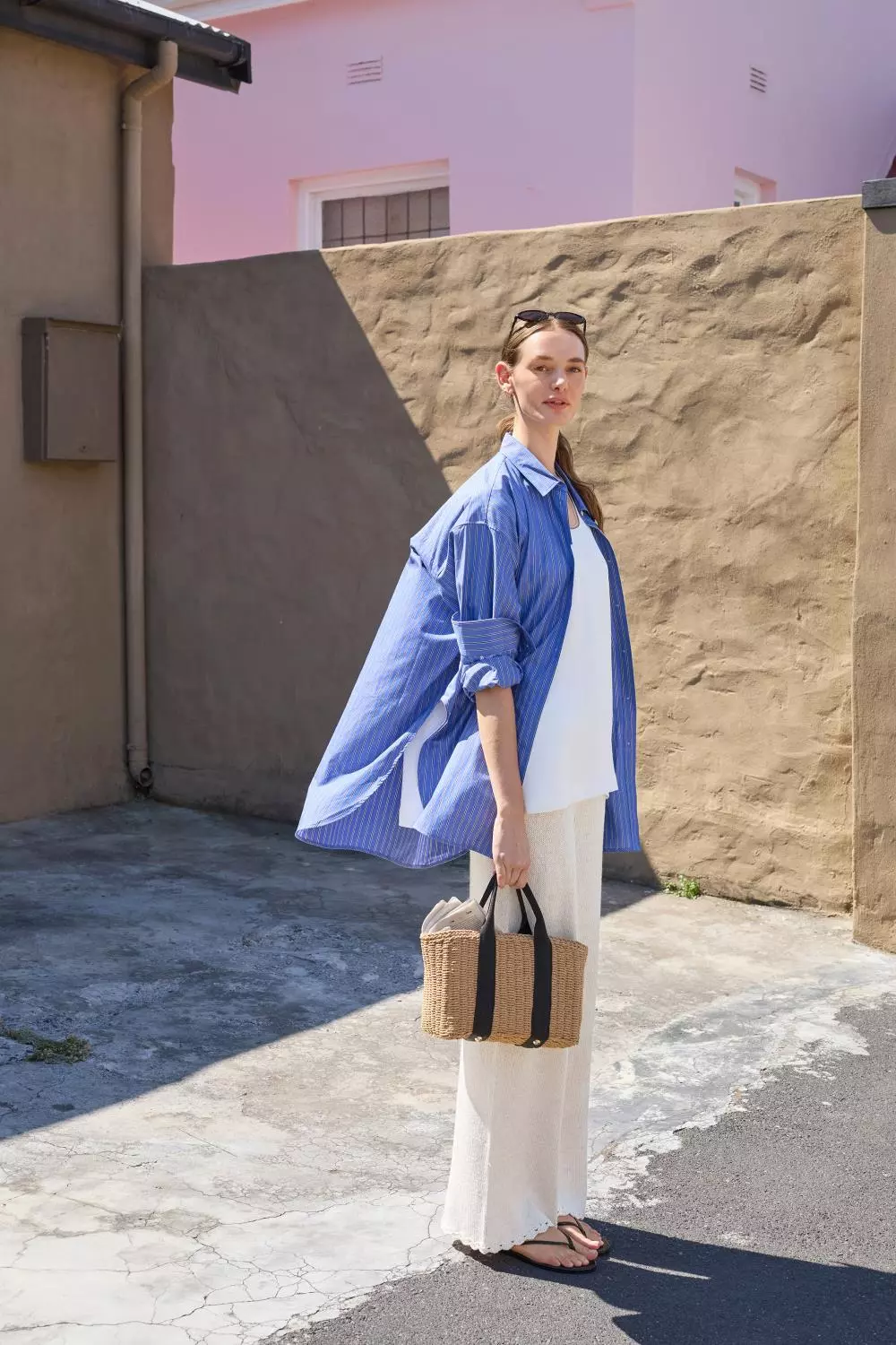 Buksen strikkes ovenfra og ned i glattstrikk med 2 tråder TYNN LINE. Velg gjerne 2 ulike farger i TYNN LINE for en melering. Det strikkes først en dobbel linning til å trekke en elastikk gjennom. Videre strikkes det vendepinner for å gjøre buksen høyere bak. Det økes masker midt foran og midt bak til kile før arbeidet deles, og hvert ben strikkes ferdig for seg. Under montering hekles det en tungekant rundt avfellingskanten nede på bena.