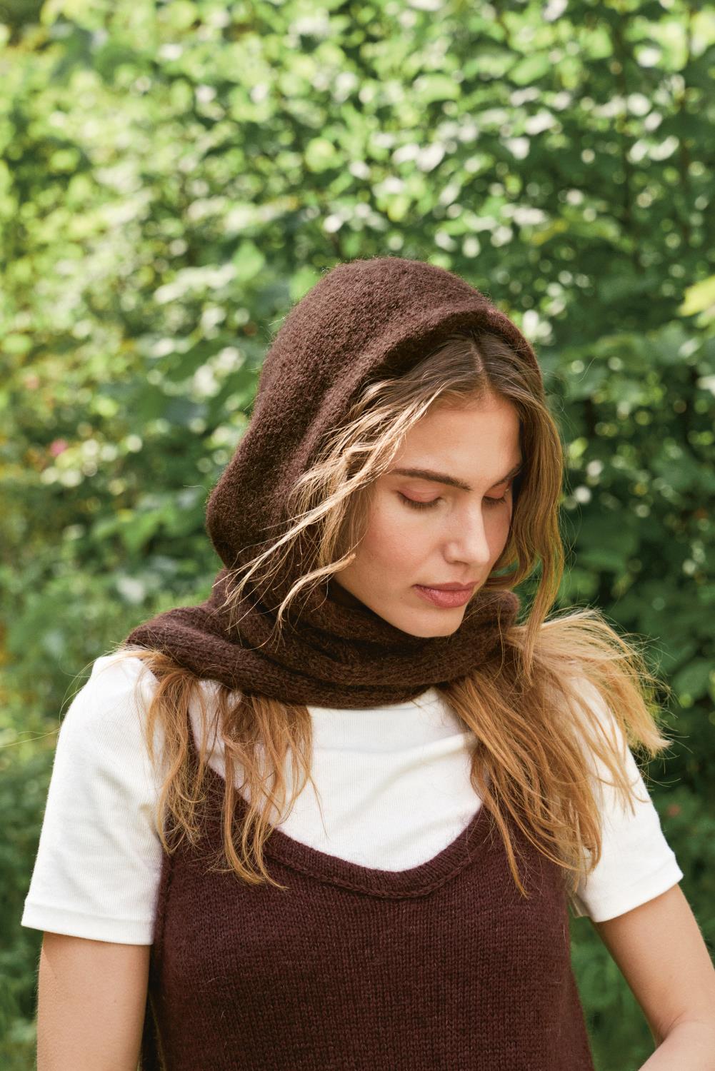Tie the hood er et skjerf og hette i ett, og strikkes i enten 1 tråd ALPAKKA ULL sammen med 1 tråd ALPAKKA FØLGETRÅD eller 1 tråd ALPAKKA ULL sammen med 1 tråd TYNN SILKMOHAIR.