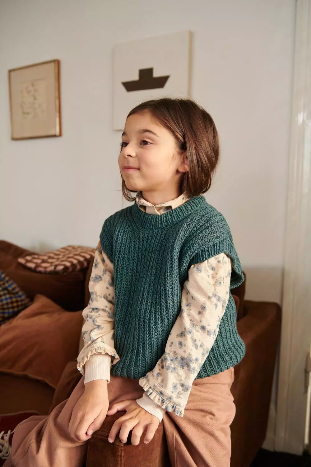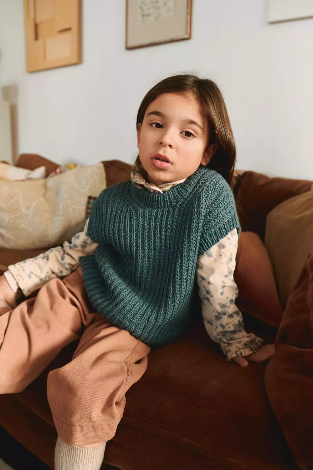 Loui Slipover Junior er et anvendelig plagg som passer både alene og over skjorte eller genser. Slipoveren strikkes ovenfra og ned i halvpatent og strikkes i Duo – en slitesterk og behagelig kvalitet for barn.