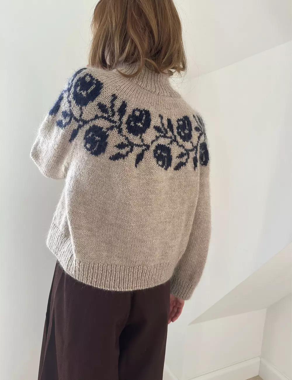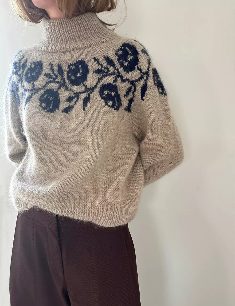 Rosie Yoke Sweater strikkes ovenfra, og roseborden strikkes inn i det runde bærestykket. Det betyr at alt mønster strikkes fra rettsiden, og dermed er lettere å strikke.