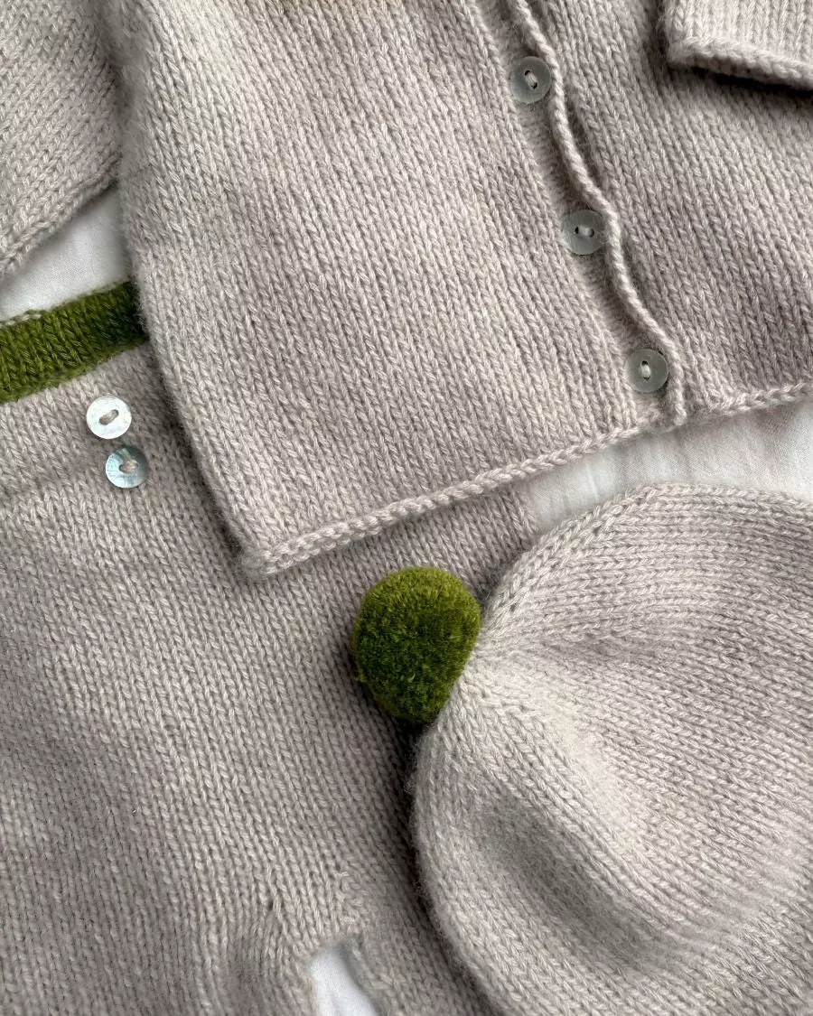 Den beige Cleo Baby Set er strikket i Cashmere fra Sandnes Garn i fargene Beige melange [3021] og Matcha [9564].