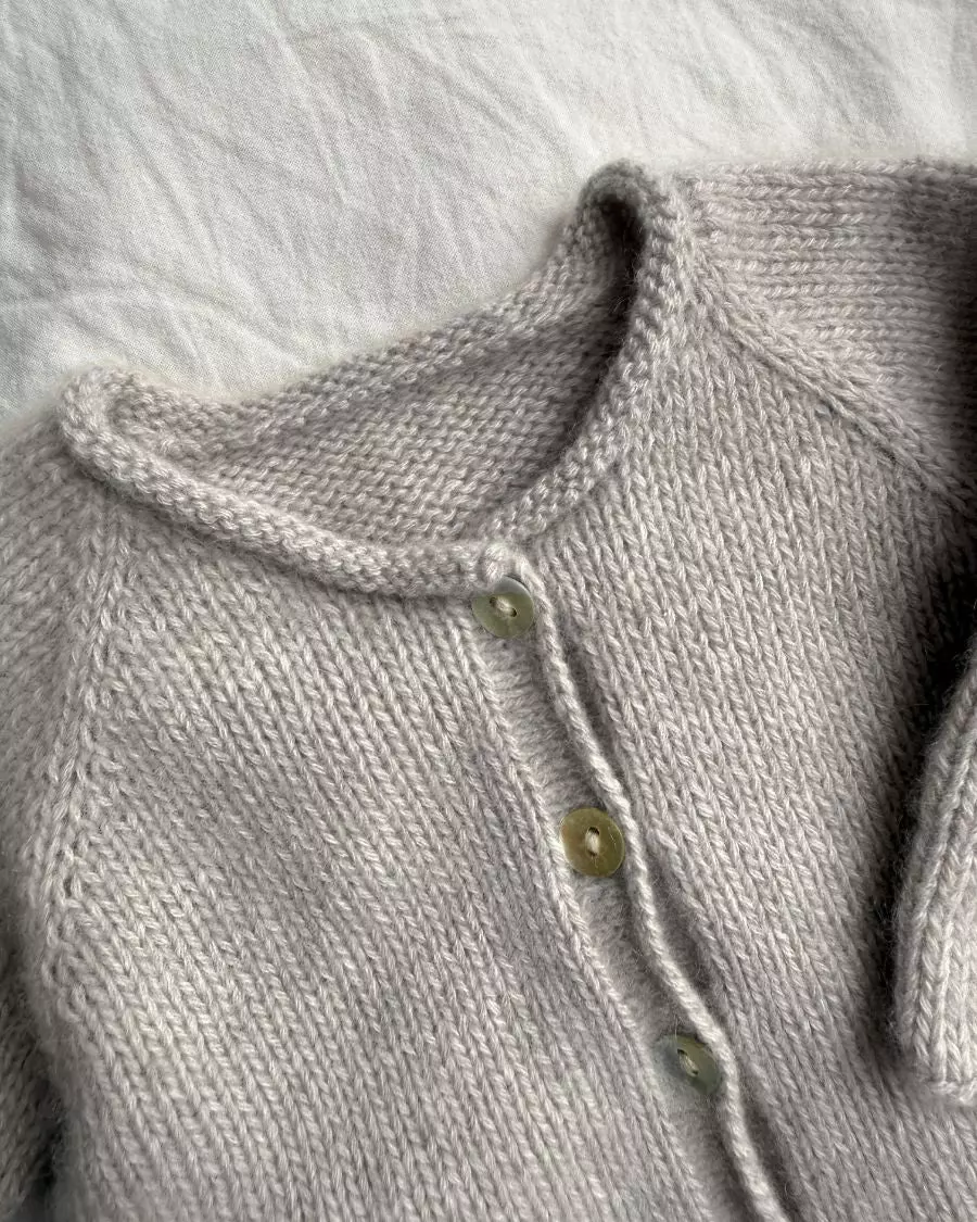 Cardiganen strikkes ovenfra og ned med raglanøkninger. Cardiganen har glattstrikkede rullekanter. Det strikkes glattstrikkede knappestolper og etterfølgende en glattstrikket halskant.
