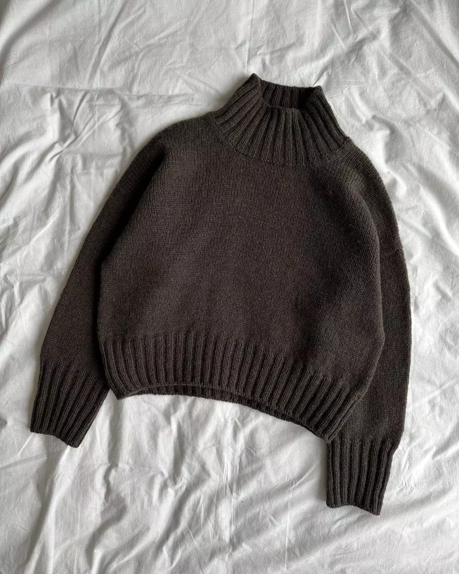 Den brune Hannah Sweater O-neck er strikket i Atlas fra Sandnes Garn i fargen Coffee melange [2381].